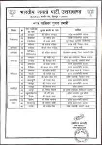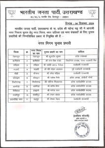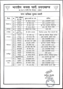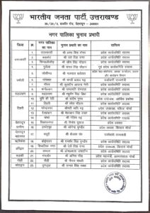 देहरादूनः उत्तराखंड में निकाय चुनाव की तैयारियां जोरों पर है। चुनाव के लिए अब भाजपा ने भी कमर कस ली है। पार्टी ने नगर निगम और नगर पालिकाओं और नगर पंचायतों में चुनाव प्रभारी नियुक्त कर दिए हैं। जिसकी सूची जारी कर दी गई है। कुलदीप कुमार को देहरादून का प्रभारी बनाया गया है।