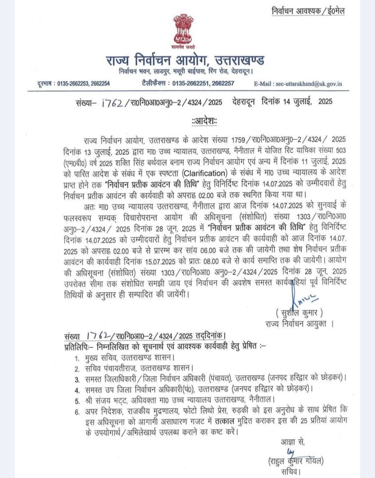 हाईकोर्ट ने त्रिस्तरीय पंचायत चुनावों में दो मतदाता सूचियों में नाम वाले मतदाताओं को मतदान का अधिकार देने और चुनाव लड़ने से संबंधित विवाद में स्पष्ट आदेश चाहने के बावत चुनाव आयोग के प्रार्थना पत्र पर कोई आदेश नहीं दिया. कोर्ट ने मौखिक रूप से कहा कि 11 जुलाई को जारी आदेश उत्तराखंड पंचायत राज अधिनियम के अनुसार है. इसलिये आयोग, पंचायत राज अधिनियम के पालन के लिये स्वयं जिम्मेदार है. कोर्ट ने कहा कि हमने चुनाव पर रोक नहीं लगाई है. केवल चुनाव आयोग द्वारा 6 जुलाई को जारी सर्कुलर पर रोक लगाई है.